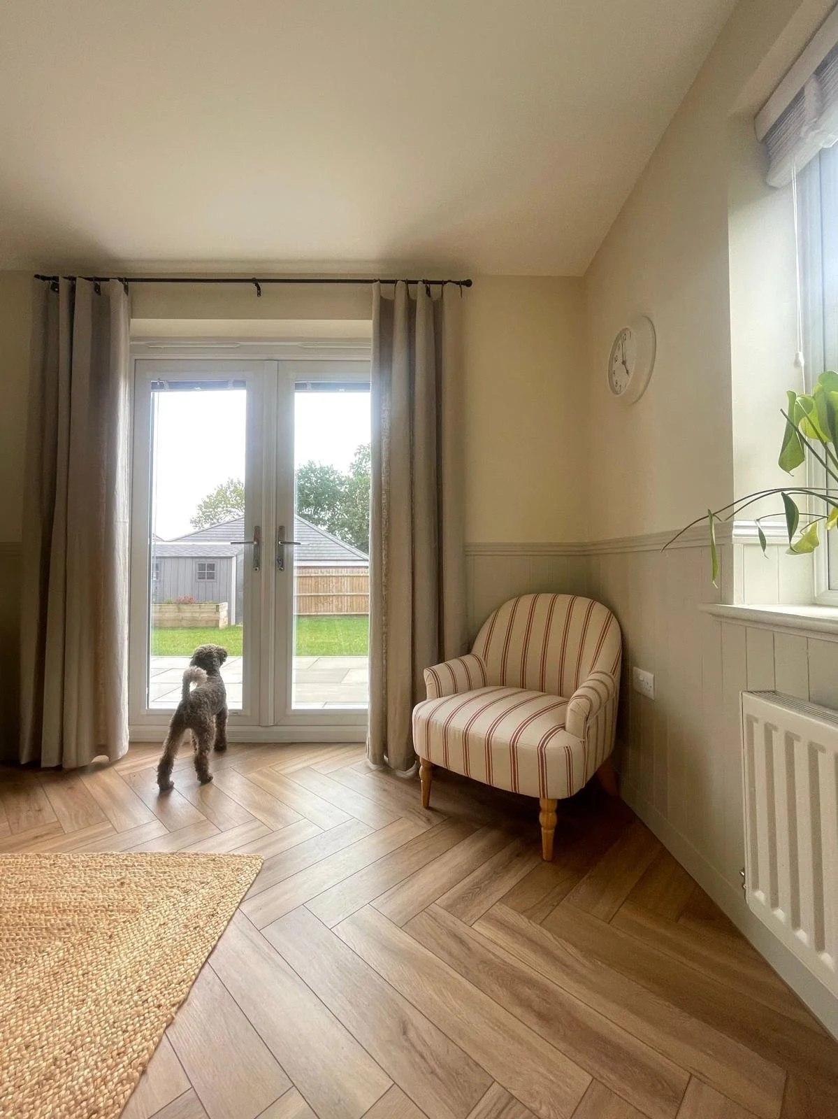 To achieve this, we introduced panelling to add depth and architectural detail, repainted in a warmer, more enveloping tone, and layered in natural materials through lighting, rugs and soft furnishings. The layout was carefully adjusted to improve flow and create more intimate, usable zones within the open space.